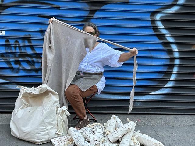 The fiber has been chosen because of the history it holds. For the NYC street performance I gathered gauze and some old muslin. Acorns, pomegranate and a combination of tea and coffee was used to shift the color, bringing my hand to the material before sharing it with others.
