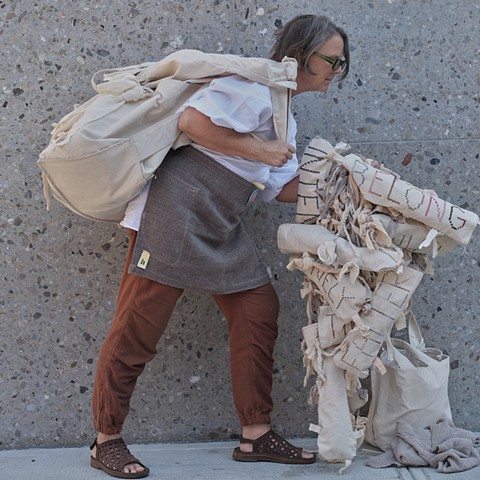 The labor of holding and carrying a very large backpack, requires the figure to bend. A form in transit taking different shapes while responding to burden and the neighborhood.